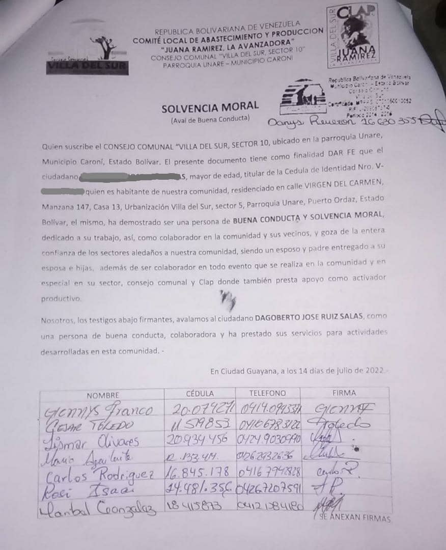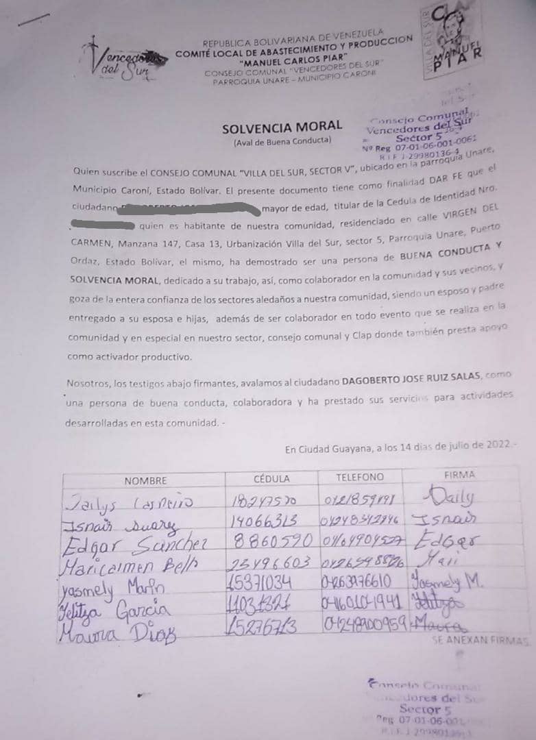 Tres diferentes consejos comunales realizaron cartas de constancia moral para brindar apoyo al ciudadano. En dichas cartas firmaron más de 70 personas para dar fe de su buena conducta.