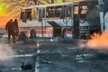 Rescatistas publicaron en la red Telegram una fotografía en la que se ve un autobús dañado frente al cual yacen cuerpos borrosos