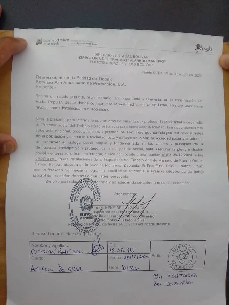 Empleados de Blindados de Oriente llevaron su denuncia hasta la Inspectoría del Trabajo, la cual citó a los representantes de la empresa para este martes 29 de diciembre a las 9:30 a.m.